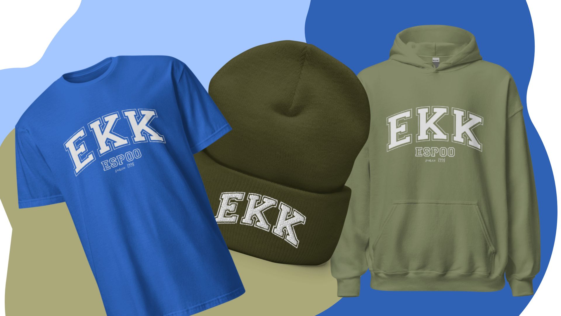 Oppilaskunnan hallitus myy taas EKK-tuotteita. Valikoimassa huppareita, collegepaitoja, T-paitoja, pipoja, kangaskasseja ja kaulanauhoja eri väreissä. Paitoja saa myös vuoden 2025 oppilaiden designkilpailun voittajadesignilla.